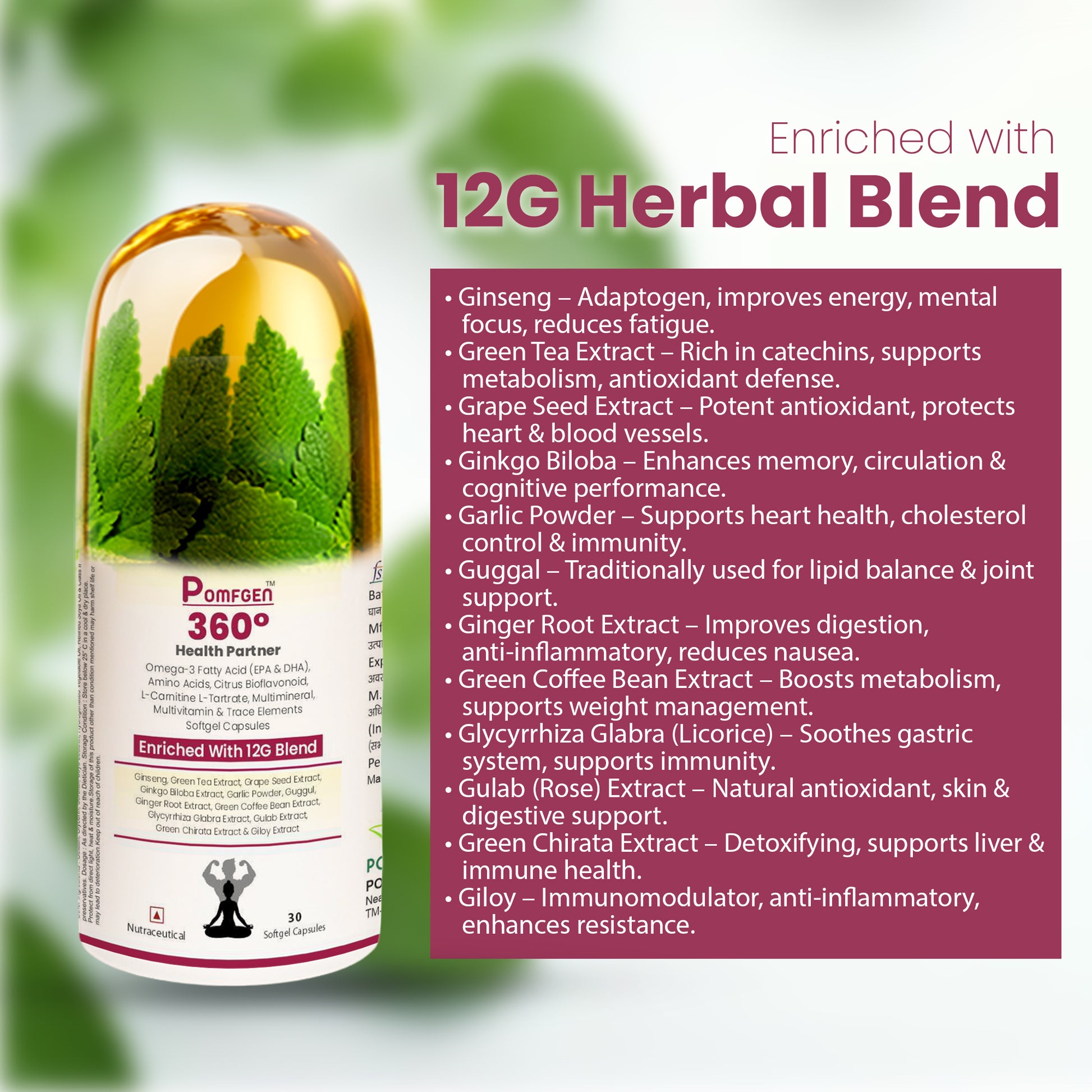 Unlock your full potential with Pomgen 360° Health Partner, the complete nutraceutical softgel designed for your modern, fast-paced life.